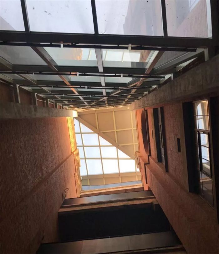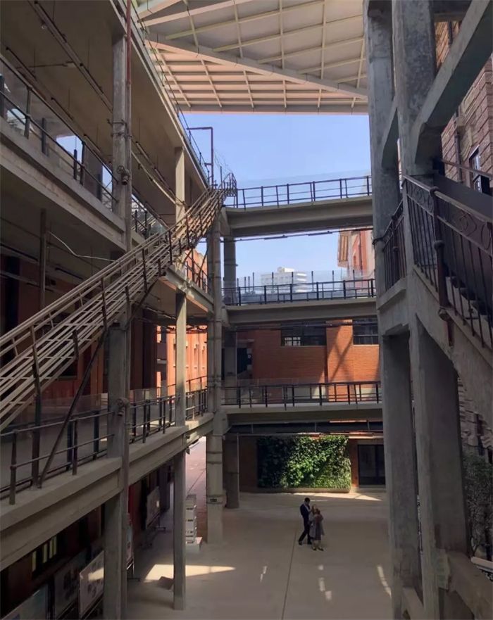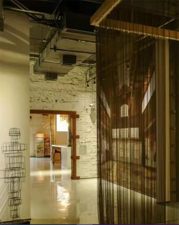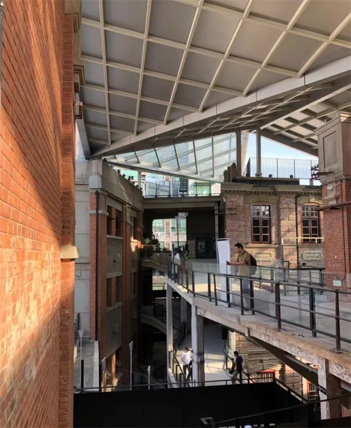 在設(shè)計保護與再利用工程時,設(shè)計師充分尊重并保護承載歷史信息與場所精神的建筑結(jié)構(gòu)與功能設(shè)施,如原始建筑立面、運輸坡道、早期消防噴淋設(shè)備、鋼梁、鋼窗、清水混凝土樓梯、吊滑門、標語等,最大程度恢復原貌;保持序列完整性,結(jié)合新的使用功能通過三條文化通廊對工業(yè)遺產(chǎn)進行空間串聯(lián)。