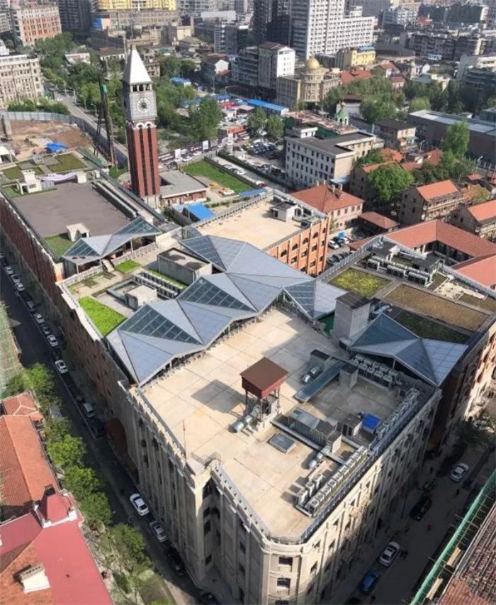 采用綠色生態(tài)建筑設(shè)計理念與技術(shù),結(jié)合在地氣候特征,整合通風、遮陽、隔熱性能,設(shè)計雨水回收、智能照明、生態(tài)種植屋面、采光天井等設(shè)施;與周圍的建筑景觀環(huán)境之間形成對話,包括歷史街區(qū)內(nèi)近距離的景明洋行、寶安洋行、麥加利銀行以及區(qū)外遠距離至長江對岸的超高層現(xiàn)代建筑景觀;注重人們在場地內(nèi)的辦公、行走、觀賞與聚集等活動體驗,通過優(yōu)化采光、設(shè)計連通頂棚、合理重組空間、整合流線、營造中庭等交流會議空間、全日制開放共享、激活屋頂露臺等方式提升空間體驗品質(zhì)。