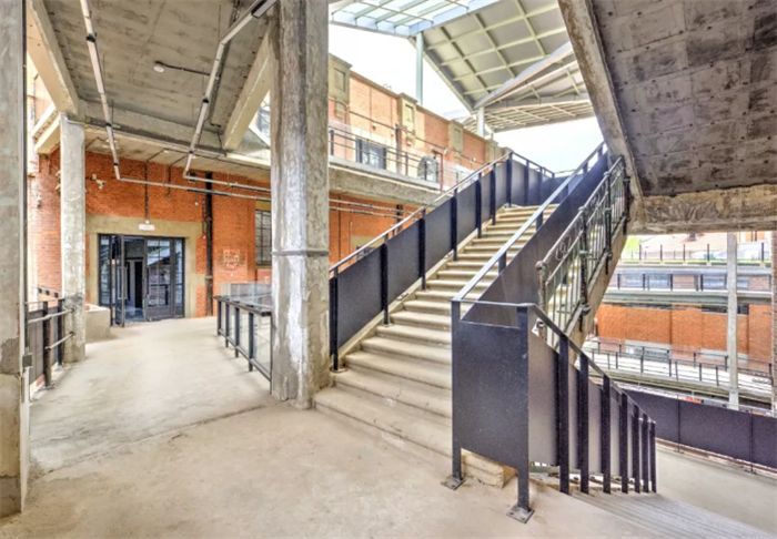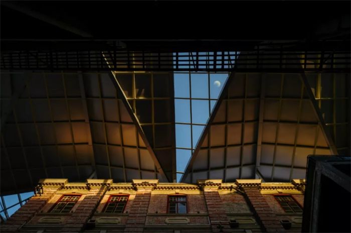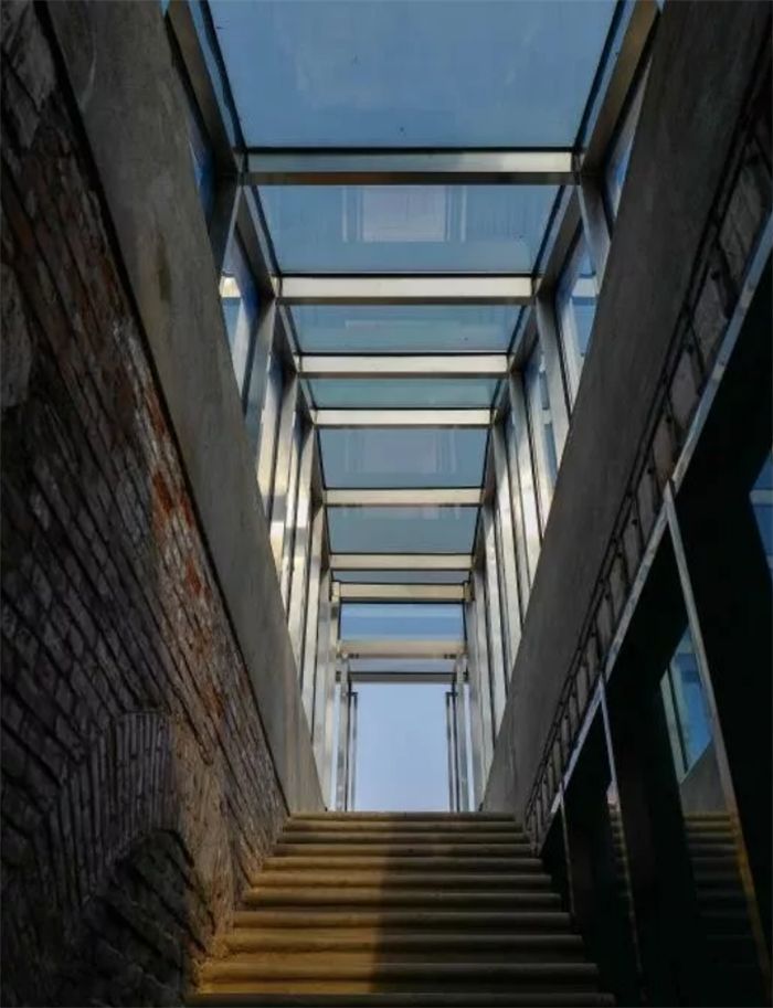 選取可逆式添建的方式設(shè)計滿足新使用功能的建筑結(jié)構(gòu),如主次入口、中庭空間與樓梯等,設(shè)計語言選擇充分提煉周邊歷史建筑坡頂、原有建筑肌理以及工業(yè)設(shè)計感極強的三角形符號,應(yīng)用在中庭、樓梯間等公共空間中。