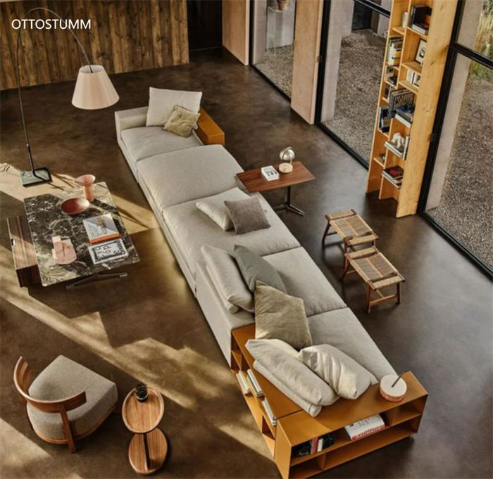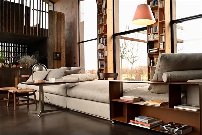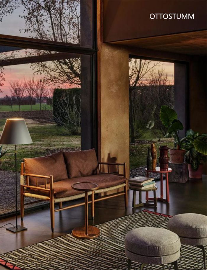 屋子中心的挑高區(qū)域是家的核心,通透明亮的落地窗展現(xiàn)窗外的四季更迭與時間律動。通透明亮的OTTOSTUMM-W75TB斷熱鋼落地窗沐浴在自然光線中,變幻出的四季的更迭與時間的律動,而樞軸門的使用讓室內(nèi)和室外之間無縫流動。在客廳的中心,奢華的Groundpiece沙發(fā)系統(tǒng)讓人如同躺臥于一個放松的小島上。