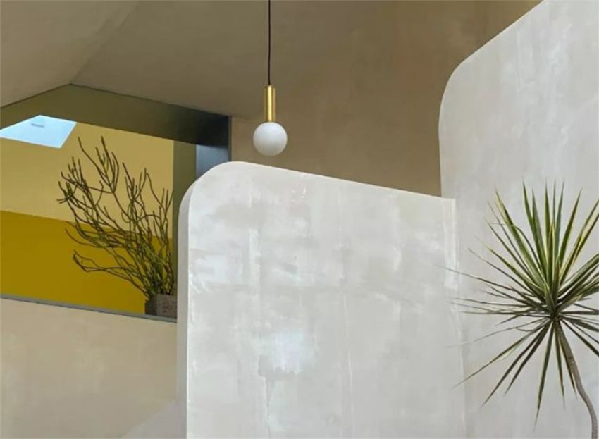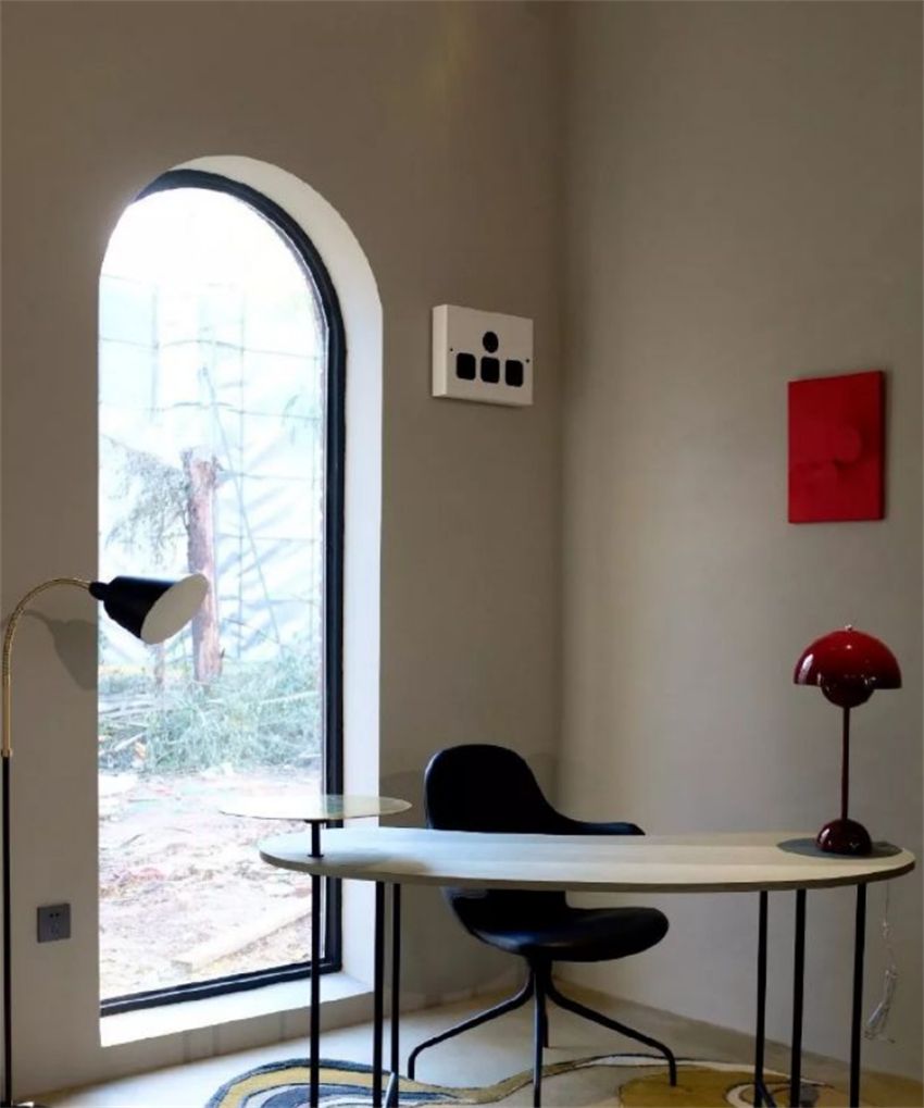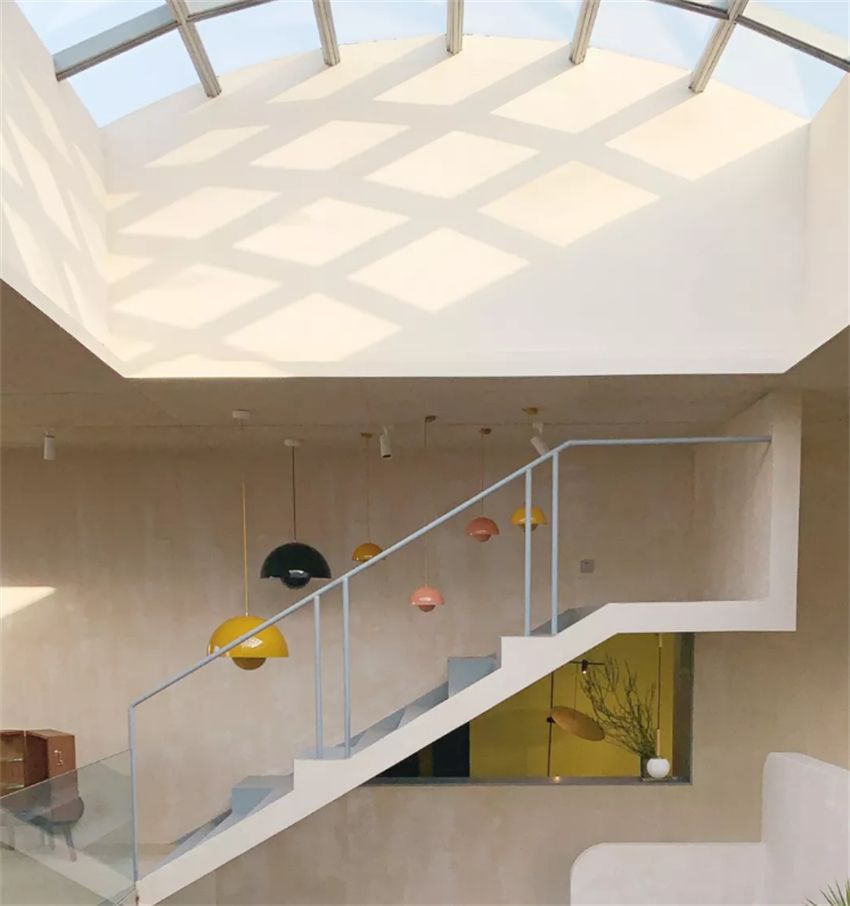 在總面積將近400平米的空間中,分為上下兩層和一個露臺。中庭的挑高設(shè)計和完美吸收光感的天井,讓整個空間開闊明亮;上下截然不同的分割布局,使空間更多了一絲神秘感。光影伴隨日光而變化,場景被柔和地分隔開來。高高垂下的綠葉,窗邊的異型雕塑,畫框一樣的門洞,是除了家具外不可忽視的生活細節(jié)。錯落有致的綠植擺設(shè),尤其是中庭里近四米高的千年木,更是給空間注入一絲自然的氣息。