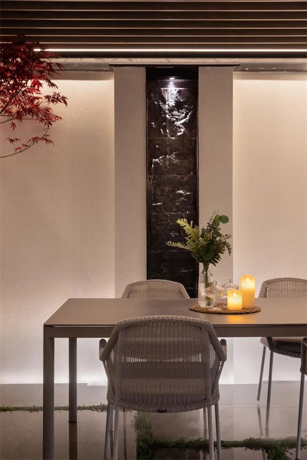 自然入景,天光水色,綠植雨雪,當雨水墜落,水面泛起的陣陣漣漪和墻壁,光影交錯,亦實亦虛,也在每天不同時刻幻化為奇妙的自然光影。