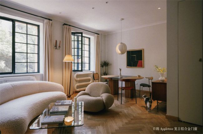 人字拼木地板和復(fù)古黑色窗格等元素共同構(gòu)建了一個(gè)簡約現(xiàn)代且不失浪漫的家。