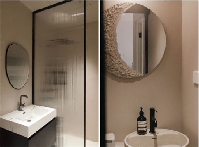 兩個(gè)衛(wèi)生間都做了偏黃色的微水泥,整體看起來干凈整潔,即使面積不大也不顯得局促。