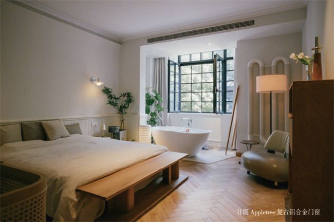 房間里的綠植與日朗格子窗外的綠意相互呼應(yīng),臥室的整體感覺是明快且令人放松的。