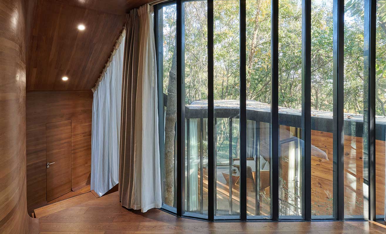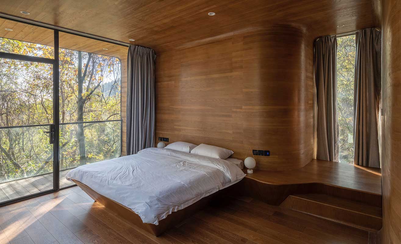 木材的廣泛使用使空間充滿溫暖,并補(bǔ)充了身臨其境的森林景觀,由大型落地玻璃提供,這些玻璃在簡(jiǎn)約的裝飾中脫穎而出。它還允許設(shè)計(jì)師通過消除所有堅(jiān)硬的邊緣來(lái)無(wú)縫融合地板、墻壁和天花板。各房間寬大的的玻璃窗,突破了建筑表皮的束縛,面向不同的角度與高度透露出室內(nèi)空間與自然接觸的迥異態(tài)度:或眺望遠(yuǎn)山的風(fēng)景,或近賞建筑周邊的野生植被,也可以走上露臺(tái)撫摸樹冠上的新葉。