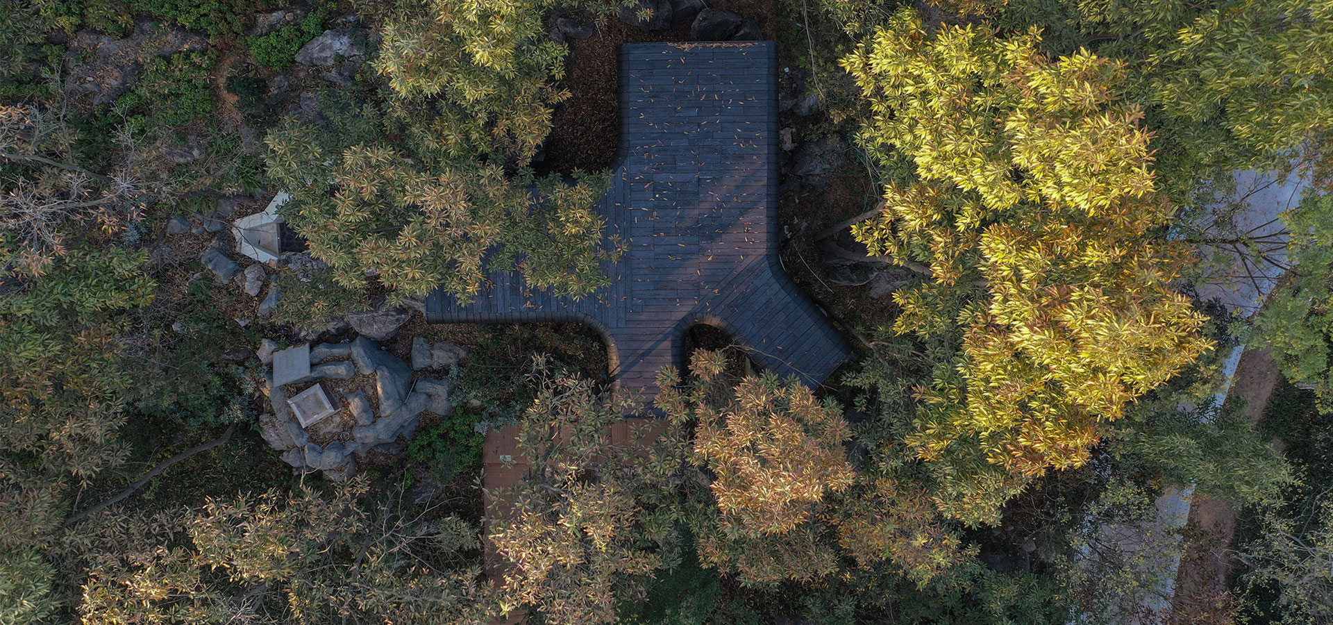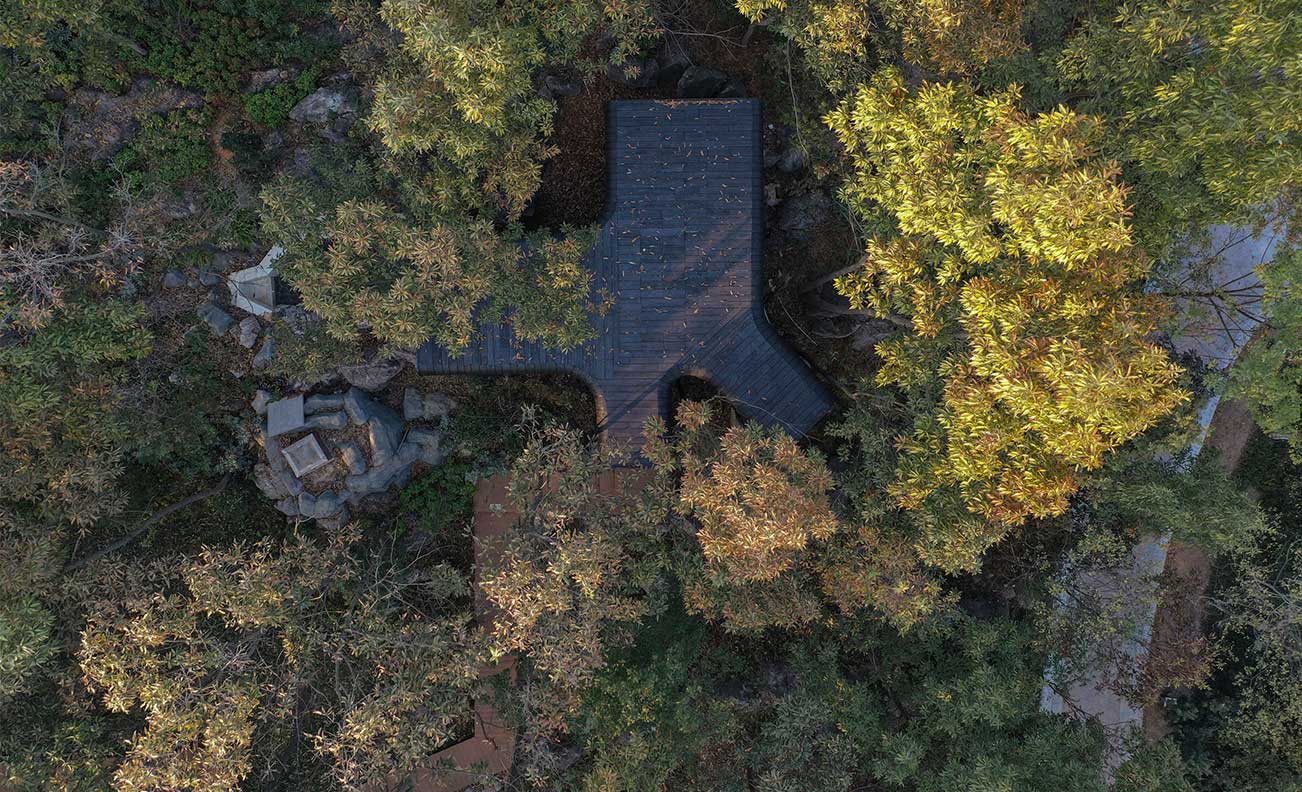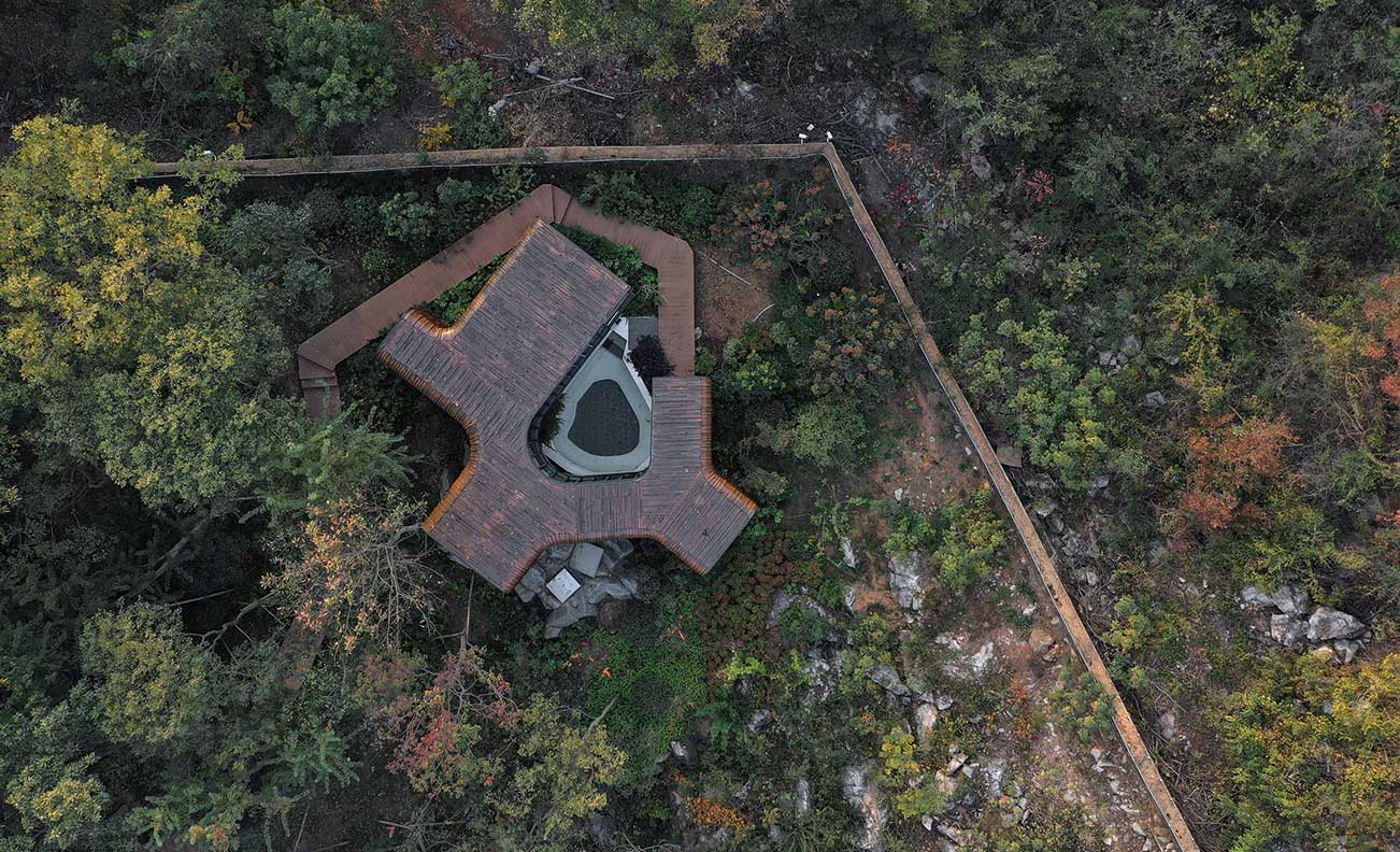 MONOARCHI度向建筑為南京一家酒店設(shè)計(jì)的四間溫泉小屋坐落在湯山的森林山麓,該項(xiàng)目占地近5000平方米,基地一側(cè)巨石成陣,在山坡的茂密樹林中如同孤島般的存在。懷揣著對(duì)大自然的敬畏,設(shè)計(jì)方案保留了自然環(huán)境的原始地貌和植被,和諧地融入自然景觀,設(shè)計(jì)師選擇了四個(gè)最具特色的位置放置小屋,由隱匿在樹林深處逐步過渡到石陣之中。同時(shí)考慮建筑與現(xiàn)存環(huán)境的互動(dòng)關(guān)系,因小屋坐落的位置不同,產(chǎn)生了兩類截然不同的趣味形態(tài)。為客人提供了充滿自然原始美景和冥想空間的沉浸式體驗(yàn)。