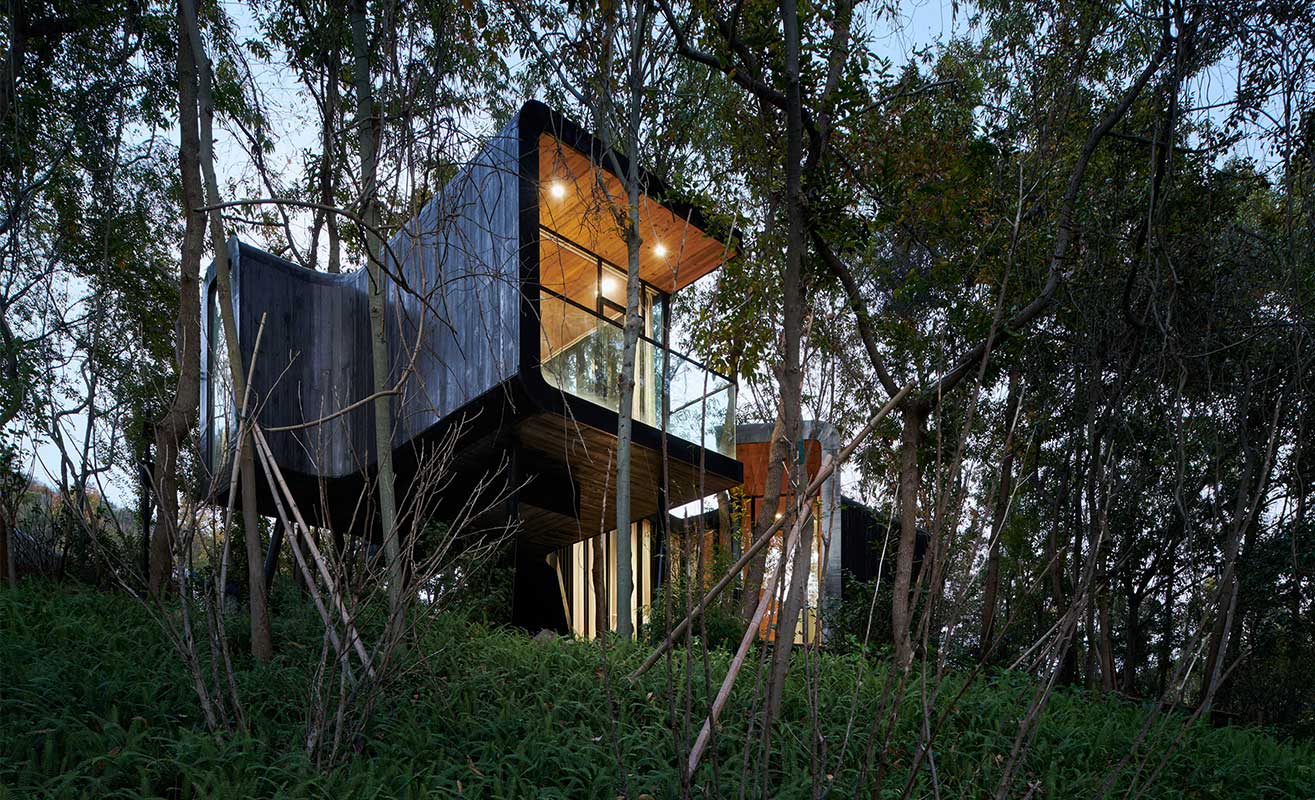 建筑師從自然元素中汲取靈感,設(shè)計(jì)了小屋和連接它們的蜿蜒路徑。四棟小屋相似的造型,卻用兩種不同的材質(zhì)表達(dá)小屋對(duì)自然的態(tài)度:樹林中的兩棟小屋使用了炭燒木作為表皮,黑色的立面將小屋隱匿在郁郁蔥蔥之間;另兩棟暴露在石陣之上與樹林邊緣的小屋,以原木色的質(zhì)感包裹了身軀,縫合自然環(huán)境與人工空間的距離。